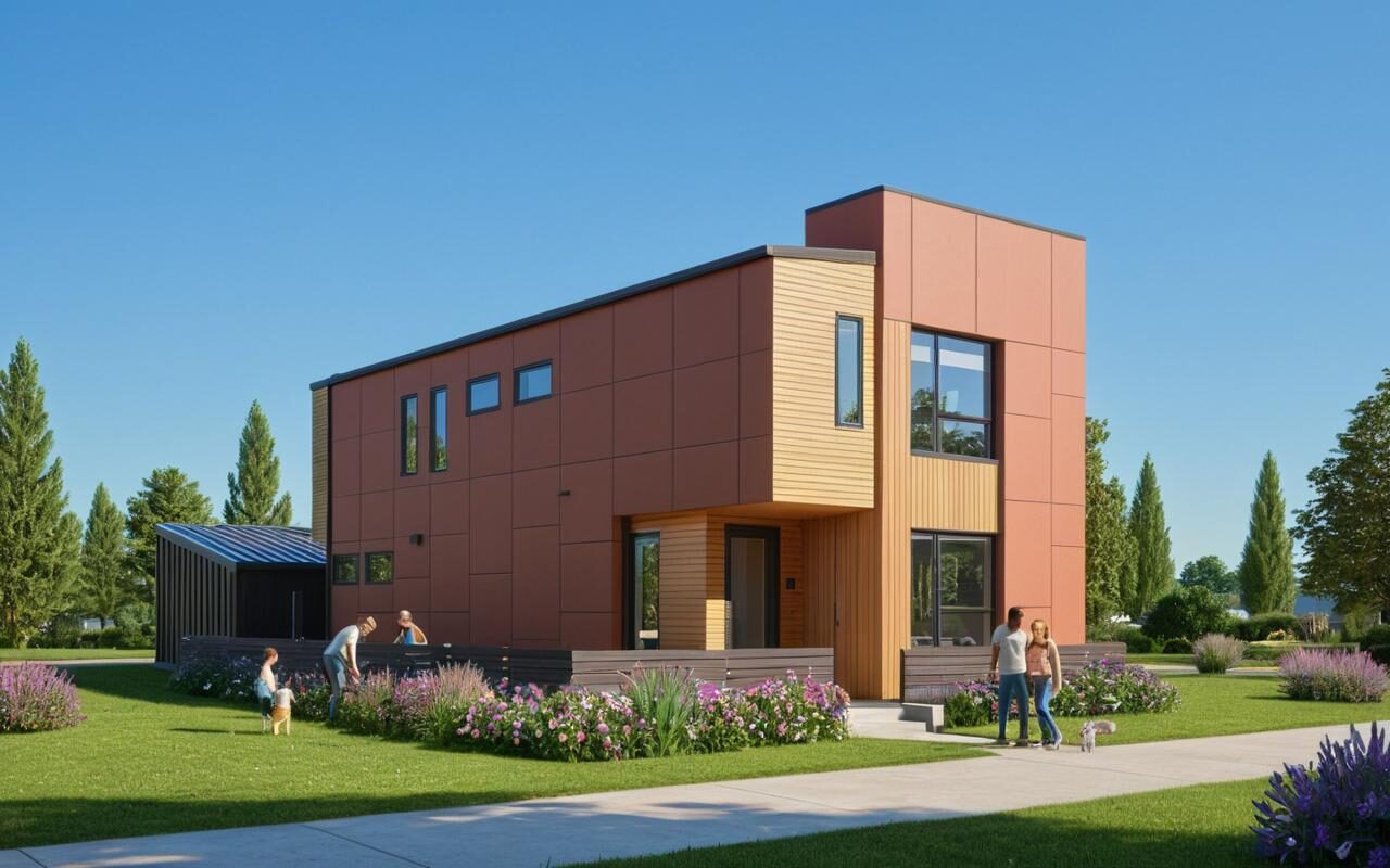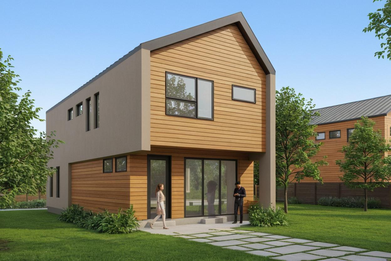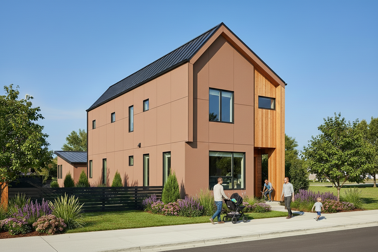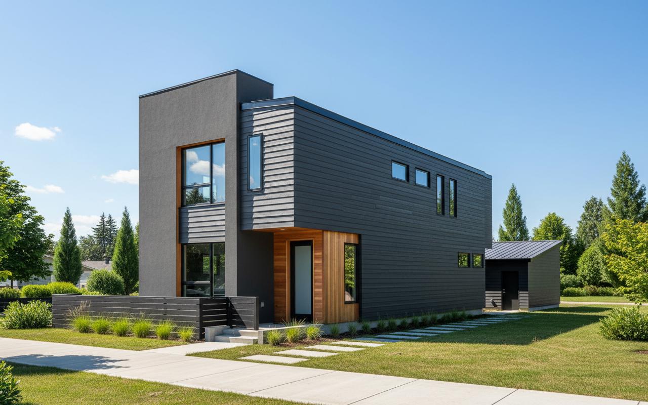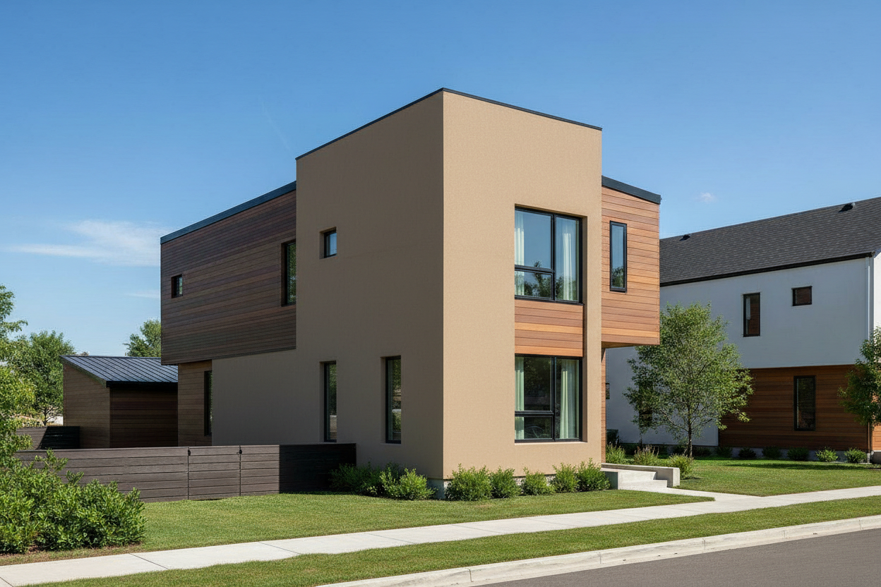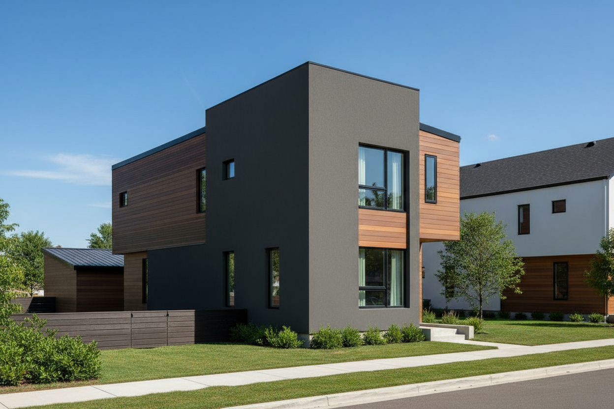 Some homes lean warm — sandy stucco paired with vertical cedar cladding and a pitched metal roof. Others go bold — charcoal horizontal siding with cedar entry accents and a flat roofline that commands the street. Every exterior is finished with low-maintenance, durable materials chosen to hold up and look right for years to come.